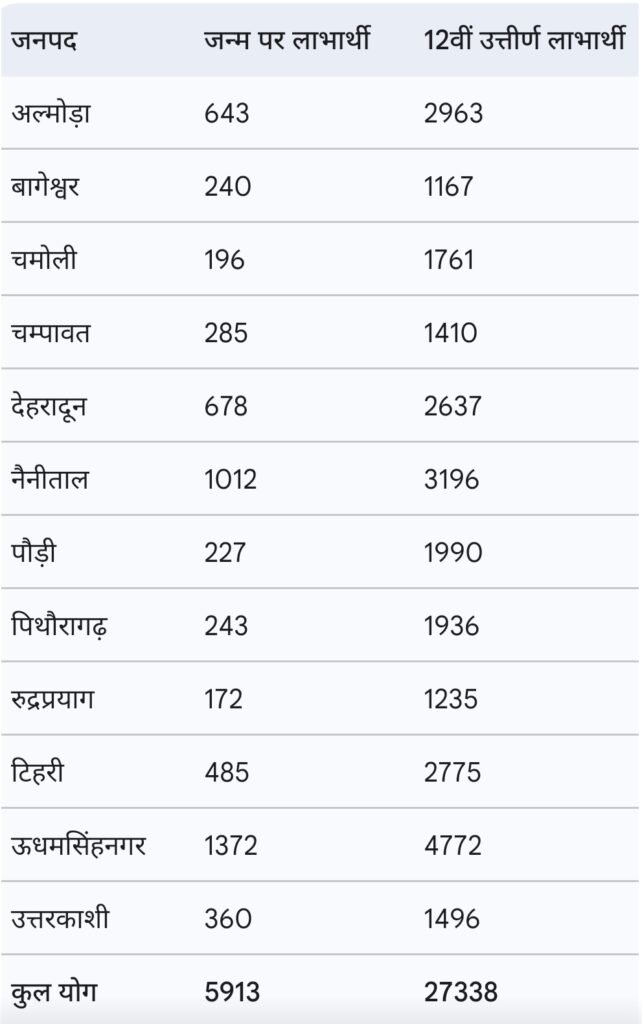 इस वर्ष कुल 33,251 बालिकाएं लाभान्वित हुई हैं, जिनमें ऊधमसिंह नगर और नैनीताल जिलों में लाभार्थियों की संख्या सर्वाधिक रही।